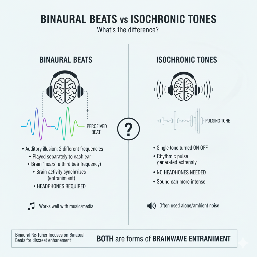 Binaural and isochronic tones are both forms of brain‑wave entrainment, but they’re produced differently: