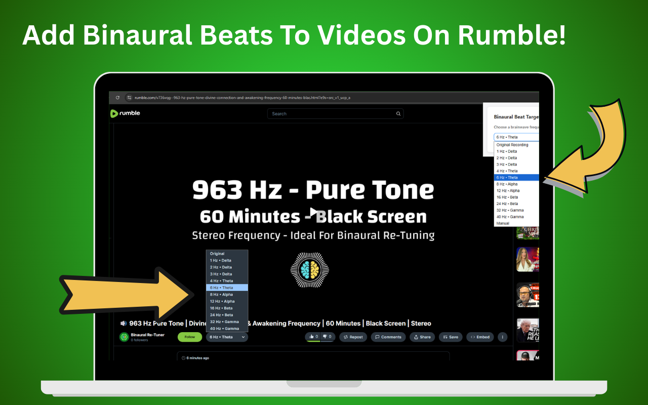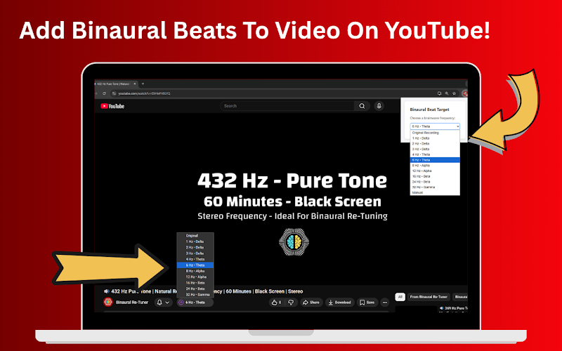 Binaural Re‑Tuner is a lightweight browser extension that adds professionally‑calibrated binaural beats to any streaming audio. After installing, simply click the icon on YouTube, Rumble or Apple Music, choose a brain‑wave mode, and enjoy enhanced focus or relaxation without switching apps. The extension works on Chrome and Edge for PC and laptop users. Your subscription unlocks all modes, pure‑tone libraries and future updates.